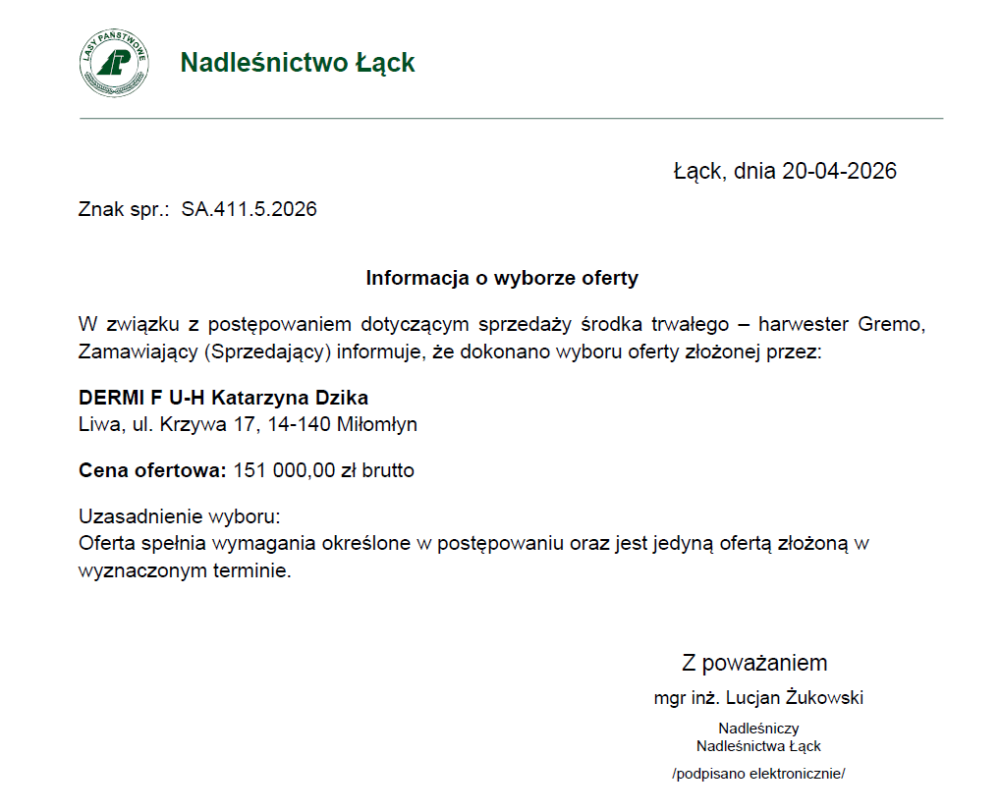 W związku z postępowaniem dotyczącym sprzedaży środka trwałego – harwester Gremo,