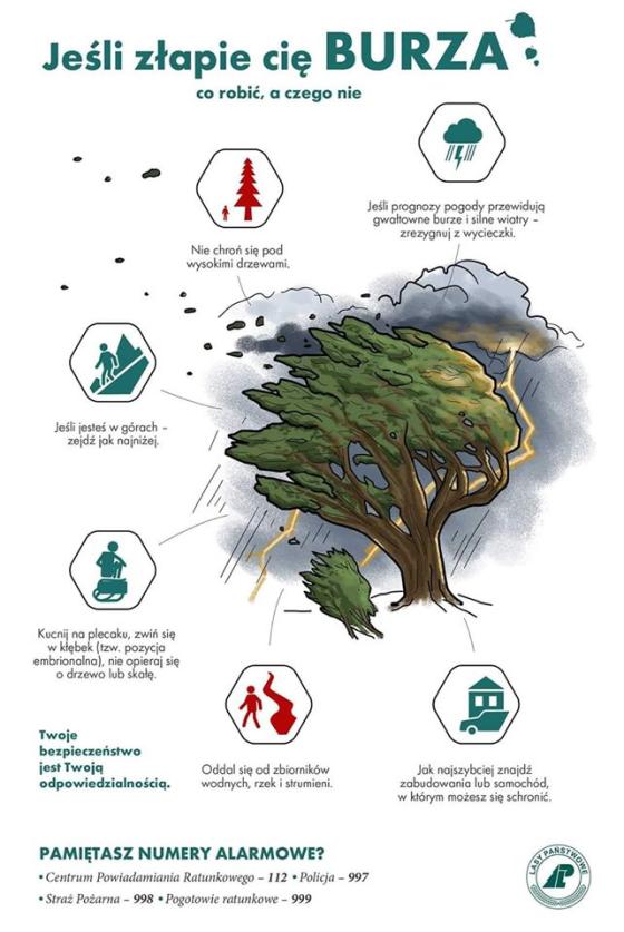- Niekorzystna pogoda (burza, silny wiatr, zalegający na drzewach śnieg, powodujący ryzyko złamania, oblodzone drogi) zwiększa ryzyko nieszczęśliwych wypadków.