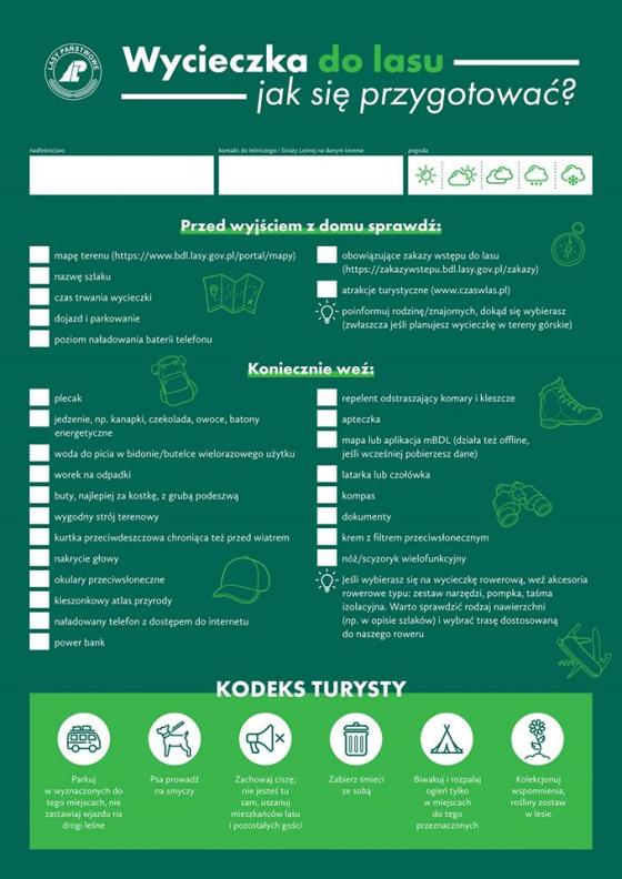 - Zachowaj ostrożność! W lesie oprócz Ciebie jest mnóstwo innych ludzi, korzystających z niego w najróżniejszy sposób. Nie zbliżaj się do niebezpiecznych miejsc, unikaj kontaktu z dzikimi zwierzętami, nieznanymi roślinami i grzybami. Nadleśnictwo nie ponosi odpowiedzialności za jakiekolwiek szkody rzeczowe lub osobowe powstałe w trakcie korzystania z lasu.